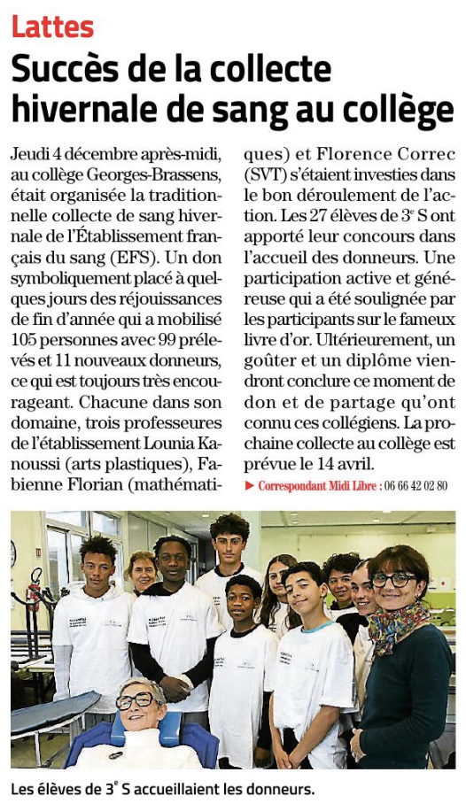 Bilan de la collecte de sang - jeudi 4 décembre
